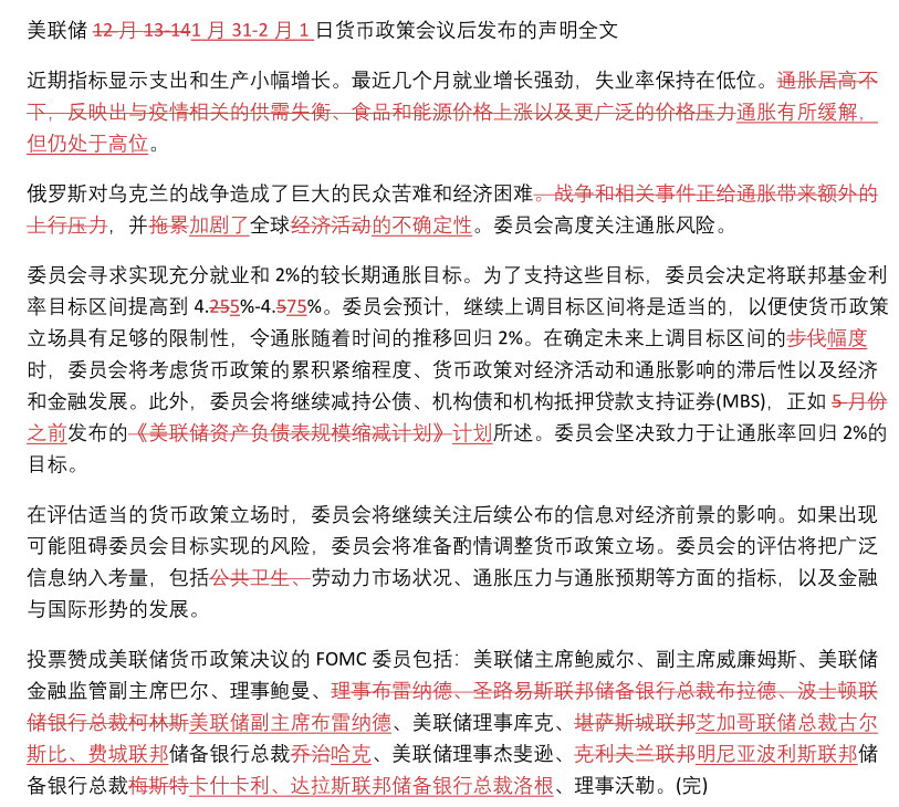 美联储利率决议全文和近两次声明对比