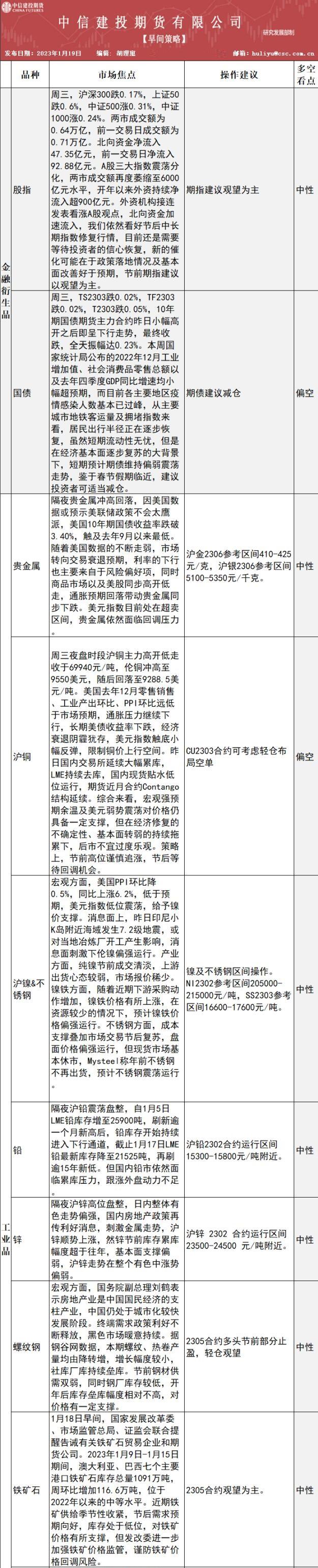 中信建投期货1月19日早间交易策略