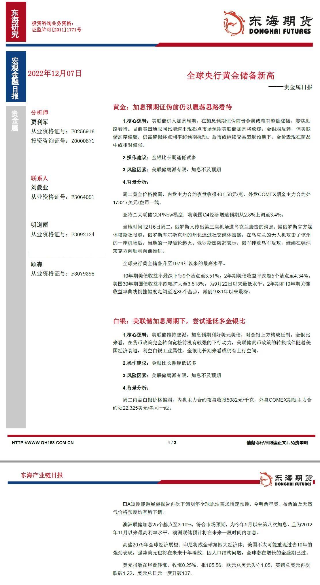 汇通财经APP讯——12月7日,长安期货发布贵金属早评,认为今日金价或震荡偏强,投资者可以逢低做多为主,注意止盈止损。 一、行情回顾 隔夜国际贵金属期货收盘涨跌不一,COMEX黄金期货涨0.11%报1...