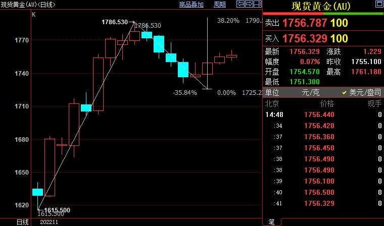 北京时间14:49,现货黄金上浮0.07%至1756.53美元/盎司;COMEX期金主力合约上涨0.65%至1756.9美元/盎司;美元指数下跌0.07%至105.772。