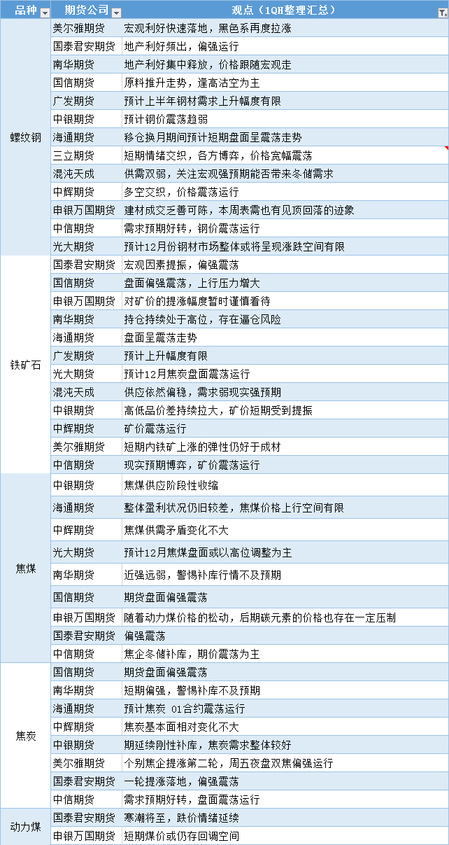 标题:期货公司观点汇总一张图:11月28日黑色系(螺纹钢、焦煤、焦炭、铁矿石、动力煤等)