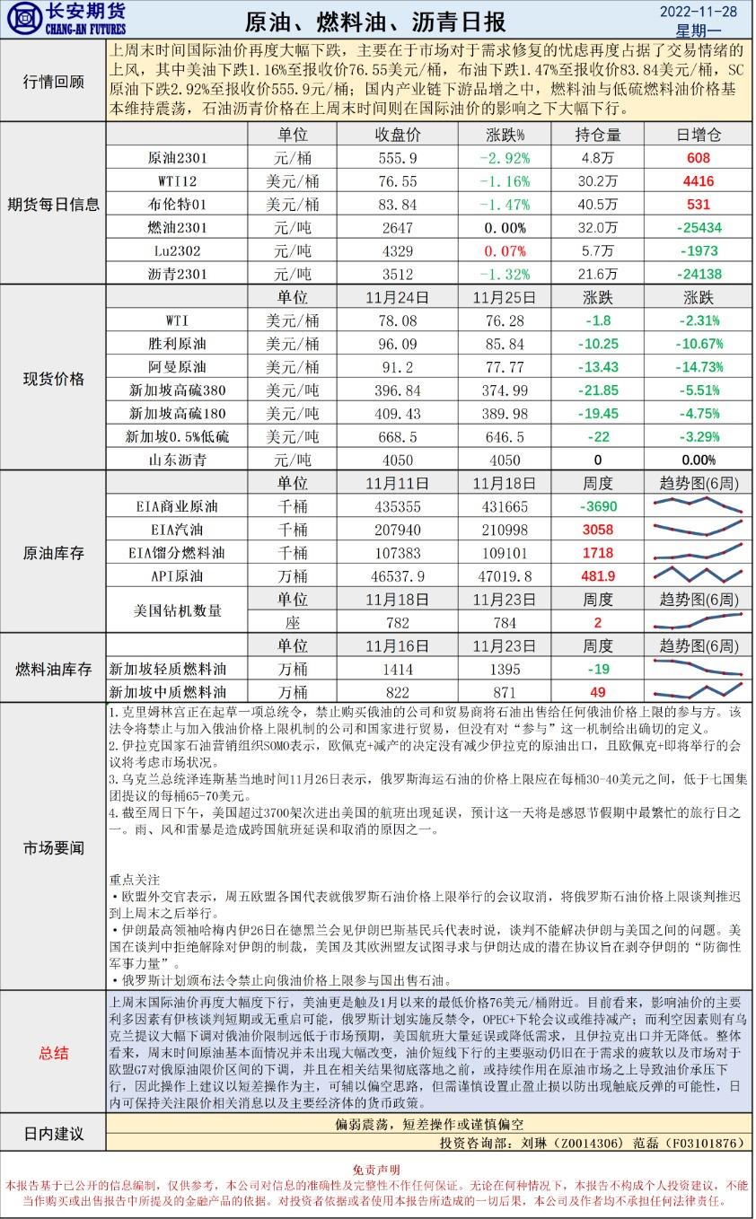 11月28日,长安期货发布原油早评,认为原油将偏弱震荡,建议短差操作或谨慎偏空。 长安期货公司授权文本由“专注期货开户交易及专业行情分析资讯网站”:【一期货 www.1qh.cn】转发