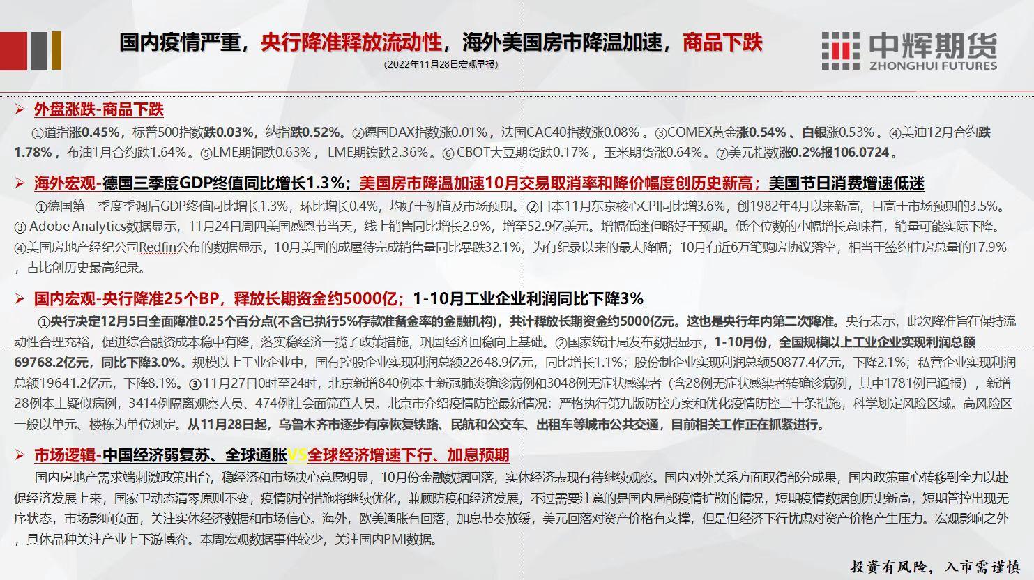 11月28日,中辉期货发布宏观早报,称欧美通胀有所回落,加息节奏放缓,美元回落对资产价格有支撑,但是经济下行忧虑对资产价格产生压力。宏观影响之外,具体品种关注产业上下游博弈。本周宏观数据事件较少,关注国内PMI数据。