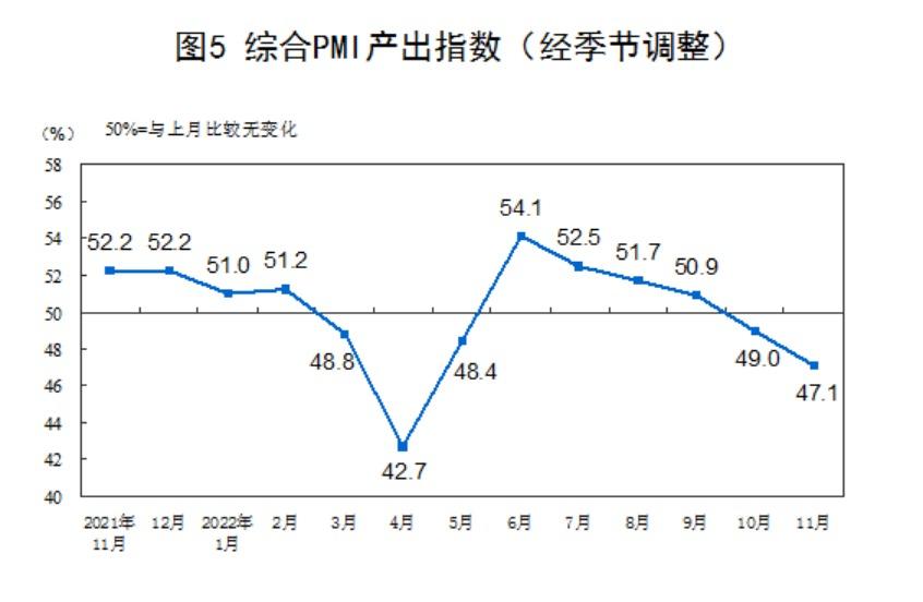 11月份,综合PMI产出指数为47.1%,比上月下降1.9个百分点,低于临界点,表明我国企业生产经营活动总体继续放缓。