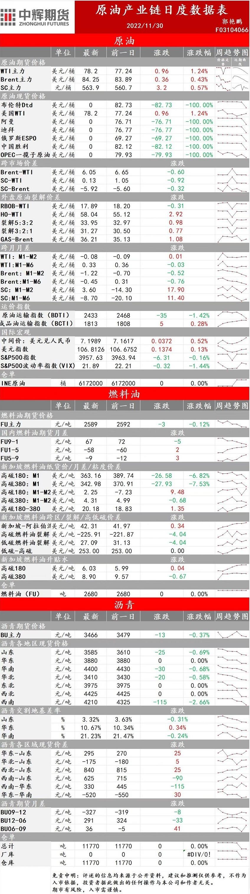 汇通财经APP讯——11月30日,中辉期货发布能源早盘关注,称OPEC+会议临近,12月5日欧盟对俄罗斯原油禁运,G7对俄罗斯原油限价,在靴子落地之前,价格预计以震荡或技术修复小幅回升为主,建议继续观望后市走势,等待12月初各项不确定因素落地。