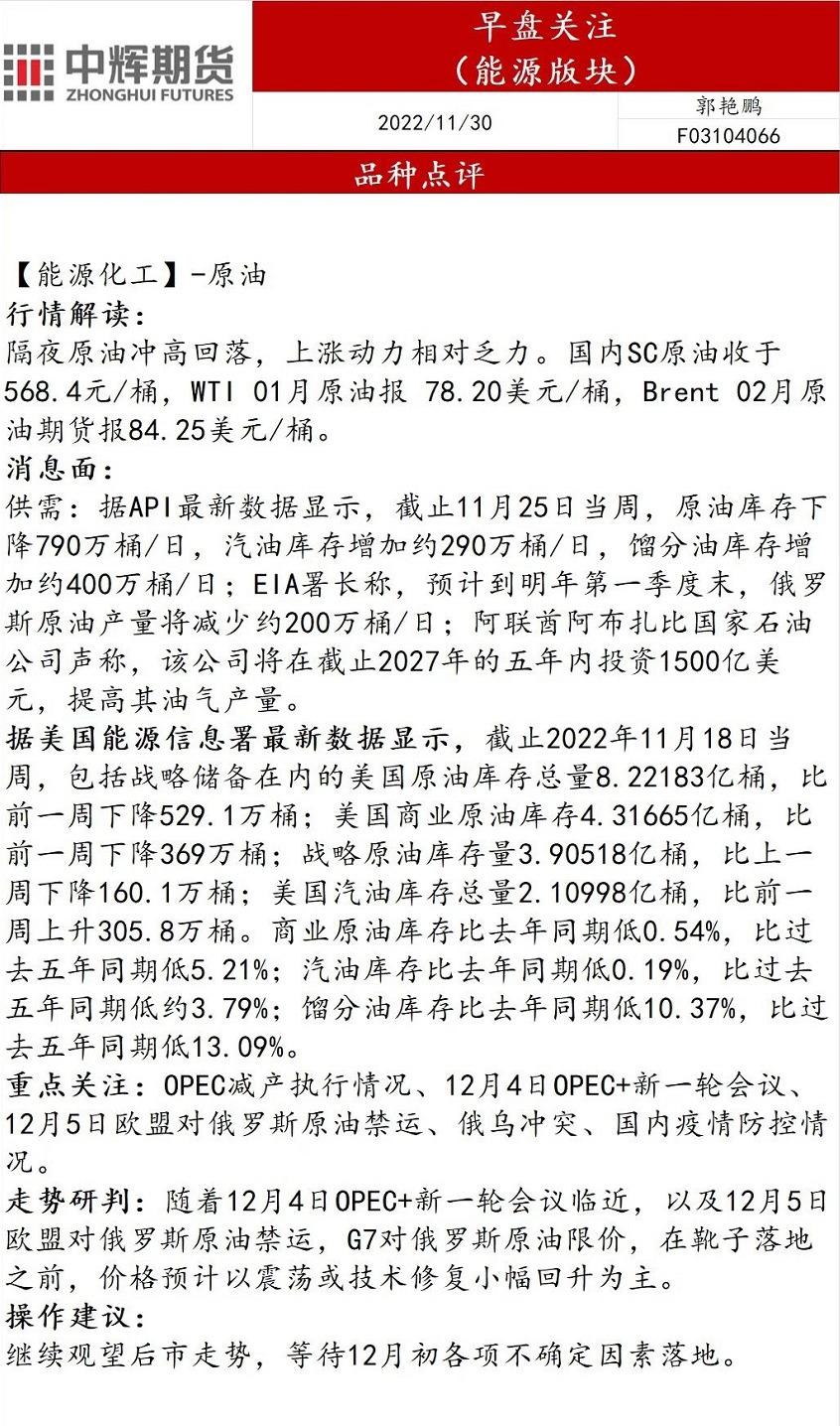 标题:中辉期货能源早盘关注:建议继续观望后市走势,等待12月初各项不确定因素落地