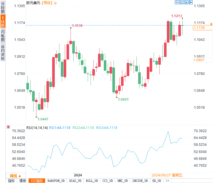 欧元兑美元下跌0.14%,报1.116美元,尽管波动较小,但整体呈现走弱趋势。欧元兑日元则下跌1.95%,至158.67日元。欧洲方面的经济数据显示,法国和西班牙的通胀率低于预期,这促使市场对欧洲央行10月降息的预期上升至90%以上。