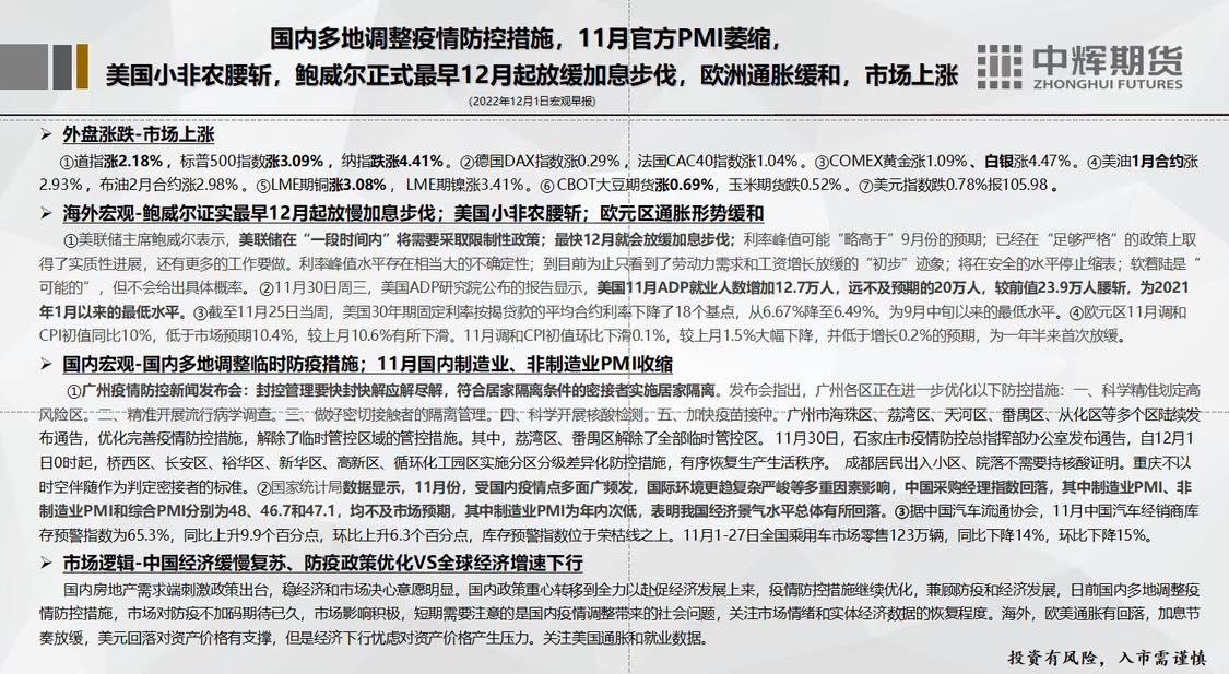 汇通财经APP讯——12月1日,中辉期货发布宏观早报,称欧美通胀有回落,加息节奏放缓,美元回落对资产价格有支撑,但是经济下行忧虑对资产价格产生压力,本周关注美国通胀和就业数据。
