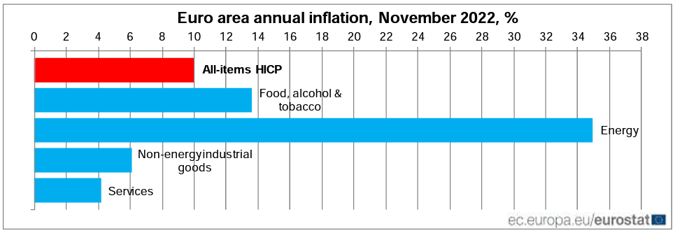 欧盟统计局说,截至11月的一年中,欧元区的通胀率上升了10%,低于10月份的10.6%,也低于经济学家普遍预期的10.4%。