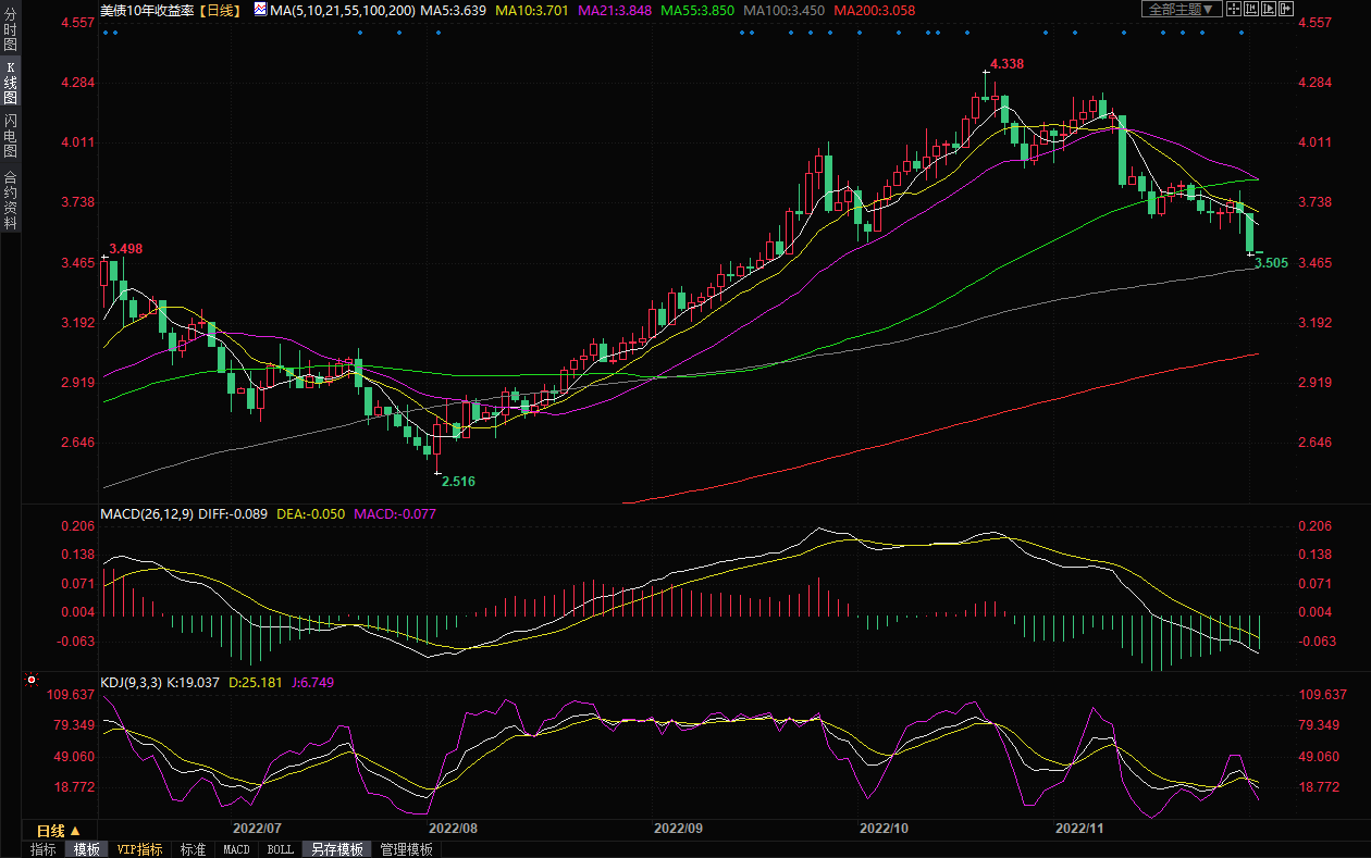 【美国国债收益率大跌创近三个月新低】美国国债收益率周四也进一步下跌,10年期国债收益率周四大跌逾4%,最大跌至3.505%,为9月23日以来新低,收报3.527%;通常反映利率预期的两年期国债收益率也触及10月初以来最低,收报4.254%。