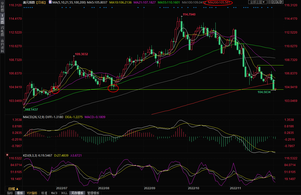 美元指数周四收跌1.22%,收报104.70,已经失守了200日均线105.56关键位置,如果不能快速回升至200日移动均线上方,这可能预示着将会进一步下跌。这将给金价提供进一步上涨动能。不过需要提醒的是,
