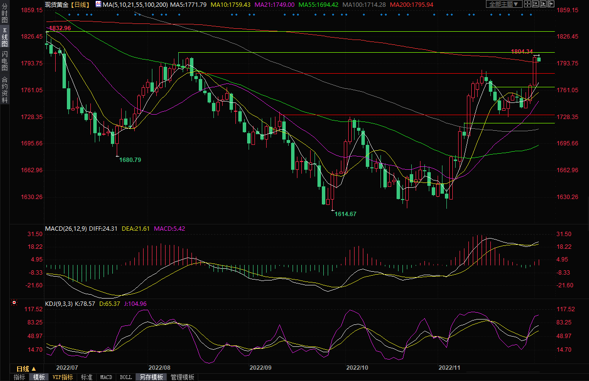 整体来看,尽管全球多数央行仍有进一步加息空间,增加持有黄金的机会成本,令多头有所顾忌,1807附近的阻力也可能会令大涨之后的金价迎来一些短线震荡调整的行情。但是,美国PCE数据显示通胀放缓呼应了美联储主席鲍威尔放缓加息步伐的言论,市场对美联储加息拐点已经到来的预期得到进一步强化,技术面看涨信号进一步加强,金价后市偏向多头。北京时间10:36,
