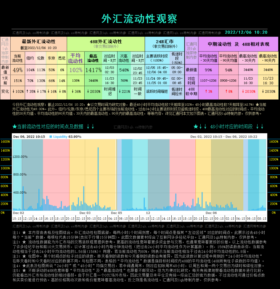 汇通财经APP讯——今日外汇流动性观察:截止2022/12/06 10:20,★以交易时间为研究对象,最近48小时平均流动性较7天前降至102%。48小时最高流动性较7天前降至1417%;★当前外汇流动性为49.00%。此外,纽约/伦敦/东京/悉尼四个主要市场的当前流动性、过去24小时主要活跃时段及超低迷时段、48H最高流动性对应的时间点、平均流动性的30天均值、平均流动性的90天均值、30天内的最高流动性、90天内的最高流动性,等等内容,详见汇通网本文如下图表。汇通网及1qh特制内参,仅供参考。