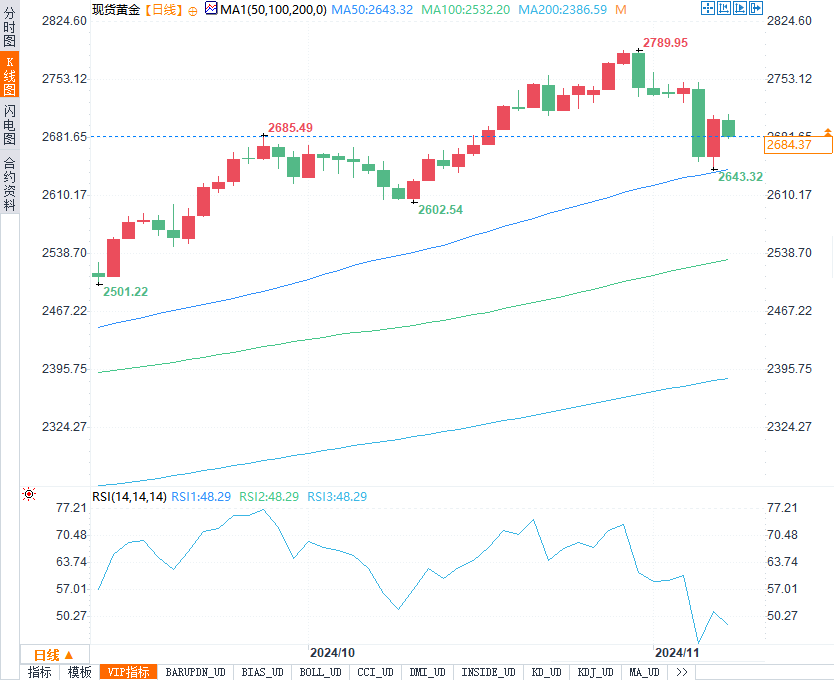 黄金价格走势主要受到大选后美元的强势压制,以及美联储降息的综合作用影响。