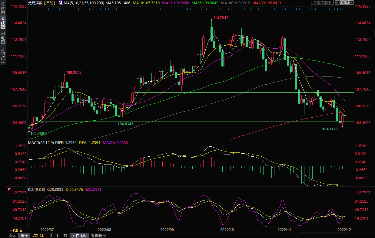 美元指数扭跌为涨,周一收盘上涨0.75%,收报105.28,为近两周最大单日涨幅,因数据显示,美国服务业活动在11月意外回升,推动人们猜测美联储可能比最近预计的更进一步提高利率。