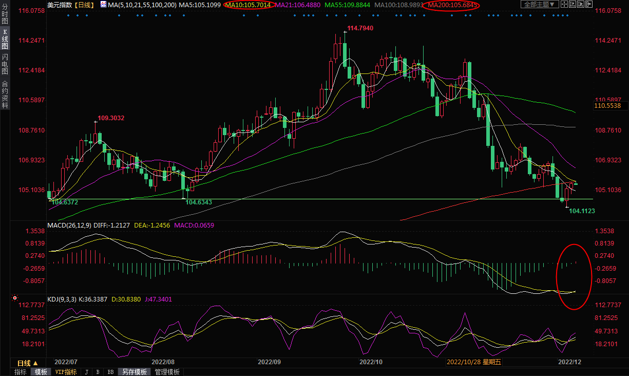 美元指数周二震荡上涨0.27%,收报105.57,延续周一的涨势,周三亚市盘初,美元指数震荡微涨,正试探200日均线和10日均线105.72附近的双重阻力,技术面来看,美元指数底背离后初步金叉,KDJ相对低位金叉,K线在相对低位录得带下影线的大阳线,短线存在进一步反弹机会,关注21日均线106.50附近阻力,这对金价不利。