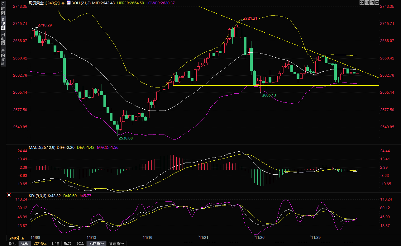 4小时级别:震荡,布林线轨道接近水平运行,留意区间突破情况,目前布林带区间在2620.46-2664.46区域。