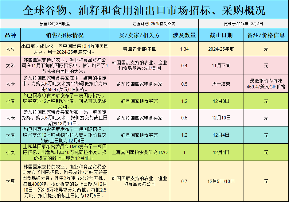 全球谷物、油籽和食用油出口市场招标、采购概况: