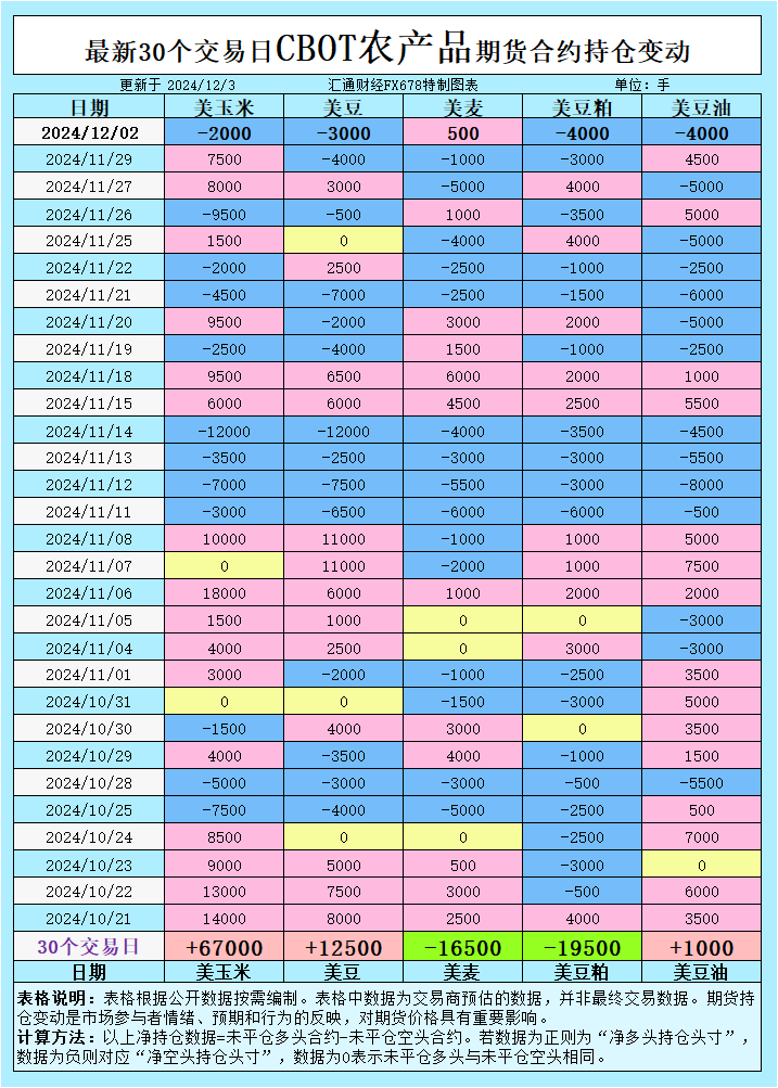 增加CBOT玉米投机性净空头;增加CBOT大豆投机性净空头;增加CBOT小麦投机性净多头;增加CBOT豆粕投机性净空头;增加CBOT豆油投机性净空头。