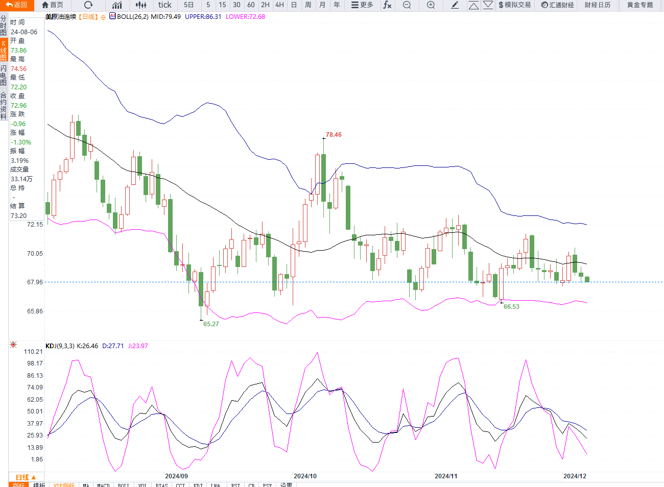 技术层面上来看,美原油日线箱体下沿附近存在破位的可能性,因布林线拐头向下,且价格带动中轨下行,同时KDJ指标拐头向下,日内若跌破66.80美元附近,则不排除空头加速下行的可能性。