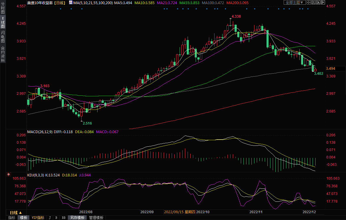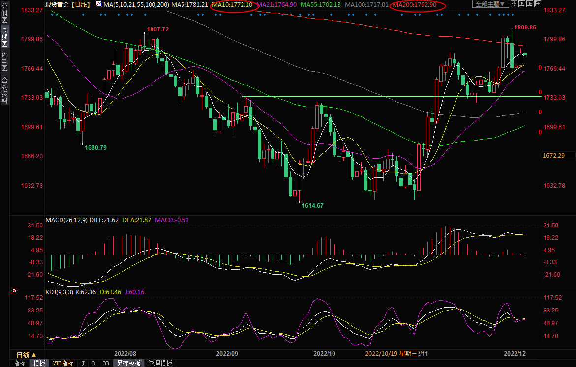 由于市场预计美联储将放缓加息步伐,美国10年期国债收益率持续走弱,周三失守100日均线一度创近三个月低点至3.402%,帮助金价从10日均线附近反弹,盘中最高触及1790.43美元/盎司,收报1785.88美元/盎司。