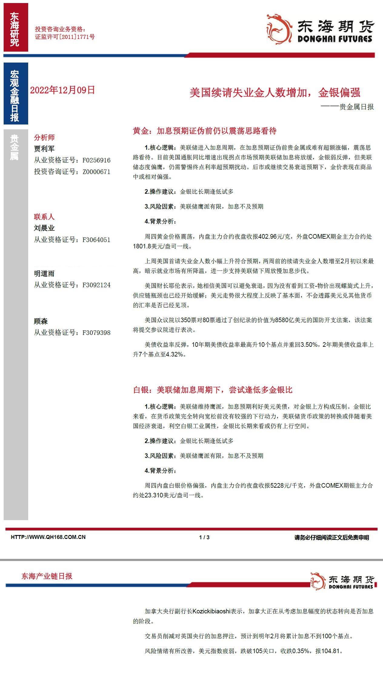 标题:【东海期货12月9日产业链日报】贵金属篇:美国续请失业金人数增加,金银偏强