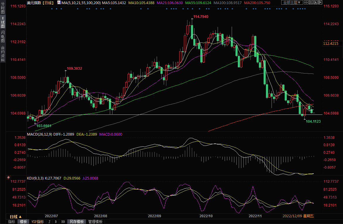 汇通财经APP讯——周五(12月9日)亚市盘初,美元指数窄幅震荡,目前交投于104.85附近;周四美元指数下跌0.37%,失守5日均线,使得汇价跌至所有均线下方,均线接近空头排列,因对美联储将放缓加息步伐的预期持续打压美元,投资者需要提防美元的进一步下行风险;下周将迎来美国11月份通胀数据和美联储利率决议,市场交投相对谨慎,因投资者需要权衡美联储的政策前景和利率上升导致经济衰退的可能性。