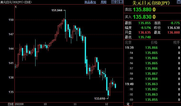 美元兑日元上涨1.14%至135.840,盘中高见137.851。美联储调升利率峰值预期走高,美元预计将保持强劲。而疲软的国内数据显示,日本10月份实际工资录得逾7年来的最大跌幅,这削弱了日元。