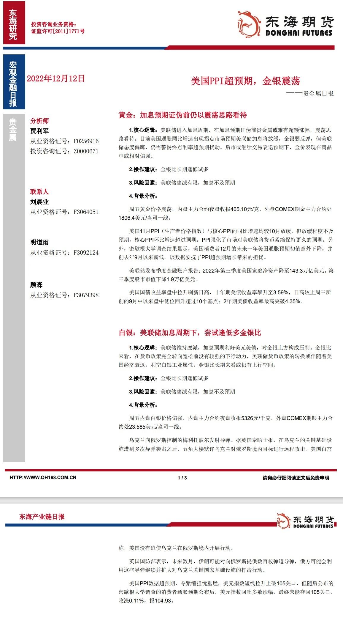 标题:【东海期货12月12日产业链日报】贵金属篇:美国PPI超预期,金银震荡