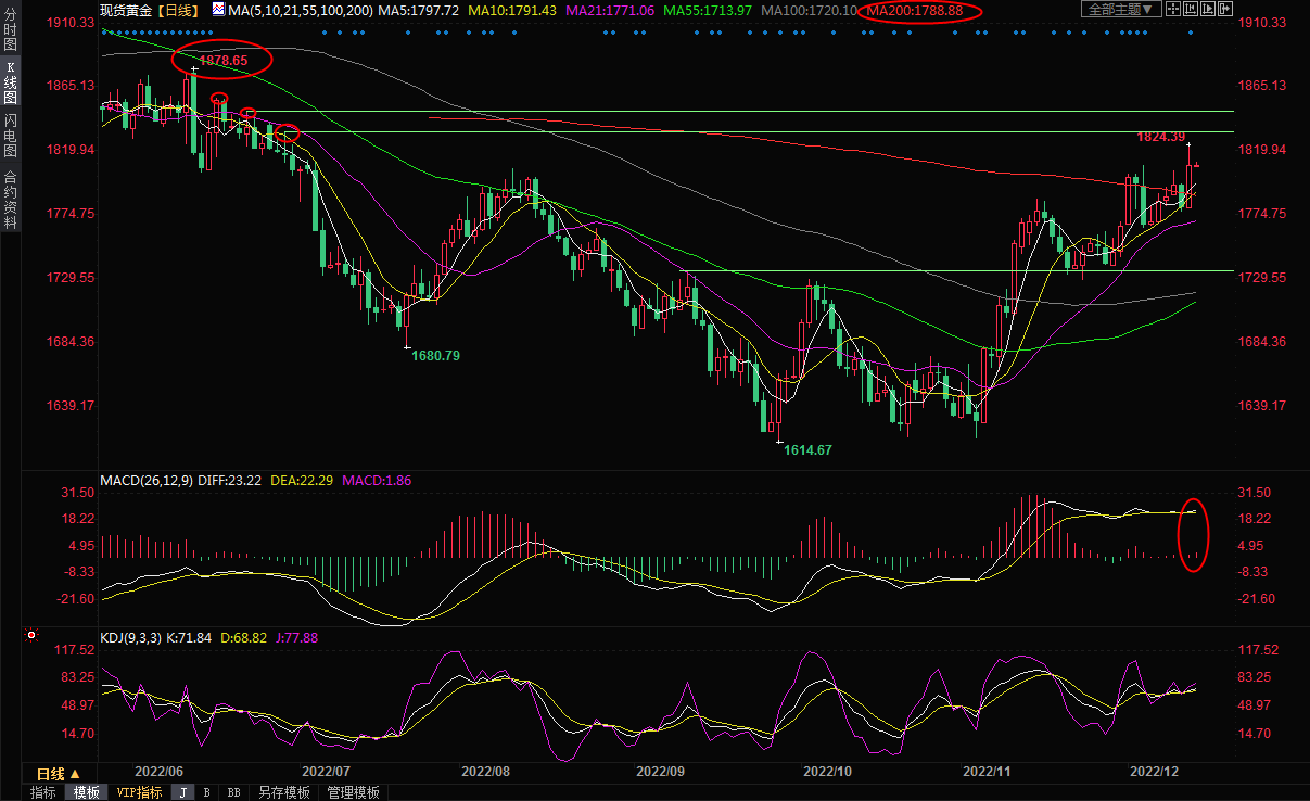 汇通财经APP讯——周三(12月14日)亚洲时段现货高位窄幅震荡,目前交投于1810关口附近,守住了隔夜大部分涨幅。周二金价大涨1.67%,盘中一度创近五个半月新高至1824.39美元/盎司,收报1810.77美元/盎司,因此前美国消费者物价的上涨幅度小于预期,推动了对美联储放缓加息的押注。