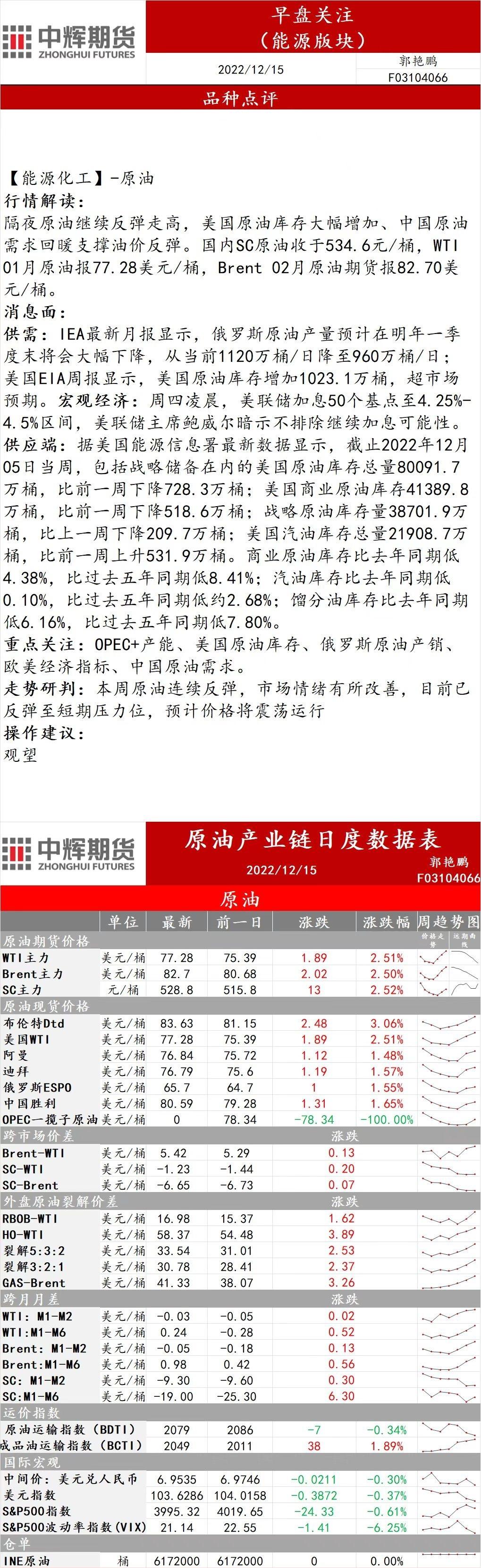 汇通财经APP讯——12月15日,中辉期货发布能源早盘关注,称市场情绪有所改善,目前已反弹至短期压力位,预计价格将震荡运行,建议观望。 中辉期货公司授权文本由“专注期货开户交易及专业行情分析资讯网站”:【一期货 www.1qh.cn】转发