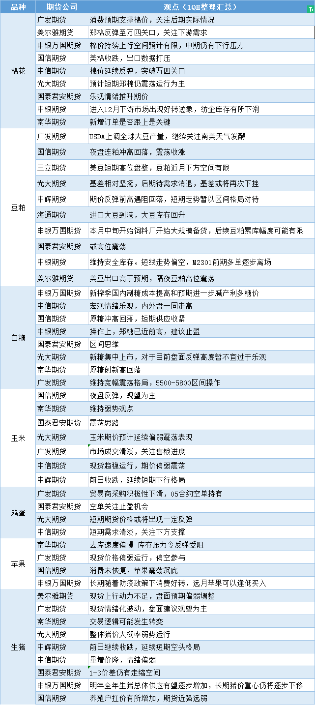 标题:期货公司观点汇总一张图:12月16日农产品(棉花、豆粕、白糖、玉米、鸡蛋、生猪等)