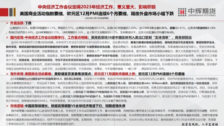汇通财经APP讯——12月19日,中辉期货发布宏观早报,称欧美通胀有回落,加息节奏放缓但是央行激进表态给市场带来压力,经济下行也在打压资产价格,关注日本央行利率决议,美国三季度实际GDP。