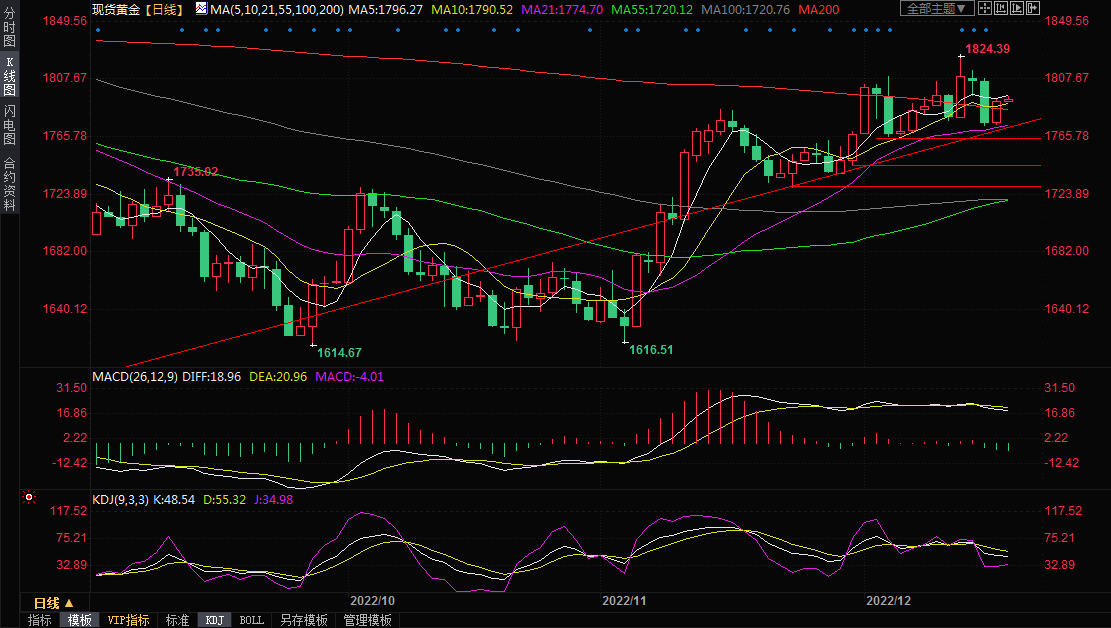 汇通财经APP讯——周一(12月19日)亚洲时段,现货黄金窄幅震荡,目前交投于1794.33美元/盎司附近,虽然上周美联储利率决议偏向鹰派,美联储多位决策者称峰值利率可能比预期更高,持续时间可能更久,令金价承压,但上周五金价仍受到避险买盘和逢低买盘的支撑,上周五金价收盘上涨0.91%,收报1792.75美元/盎司。