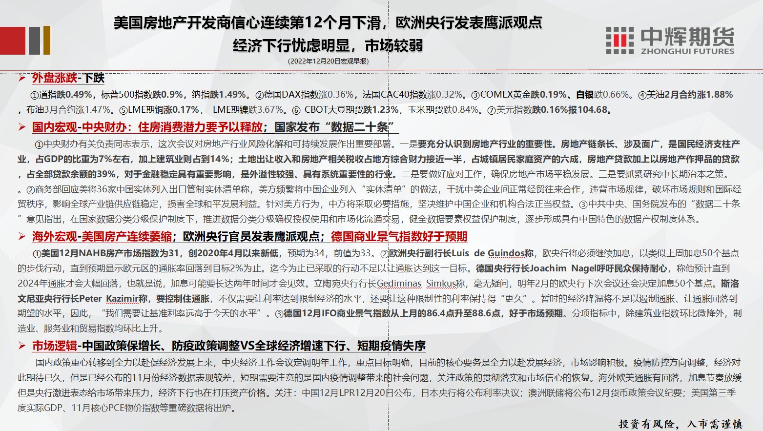汇通财经APP讯——12月20日,中辉期货发布宏观早报,称欧美通胀有回落,加息节奏放缓,但是央行激进表态给市场带来压力,经济下行也打压资产价格,本周关注日本央行决议,澳洲联储12月货币政策会议纪要,美国第三季度实际GDP,11月核心PCE物价指数等数据。