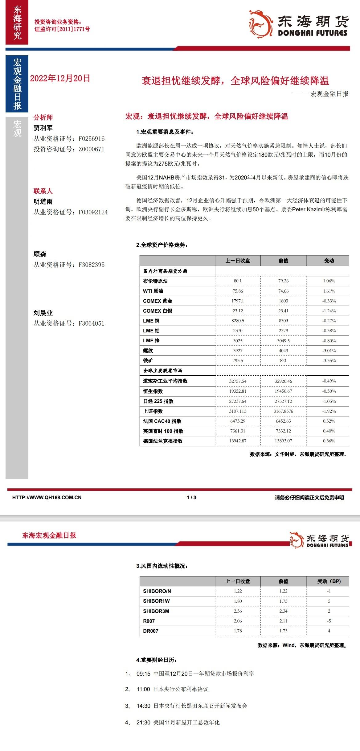 标题:【东海期货12月20日宏观金融日报】:衰退担忧继续发酵,全球风险偏好继续降温