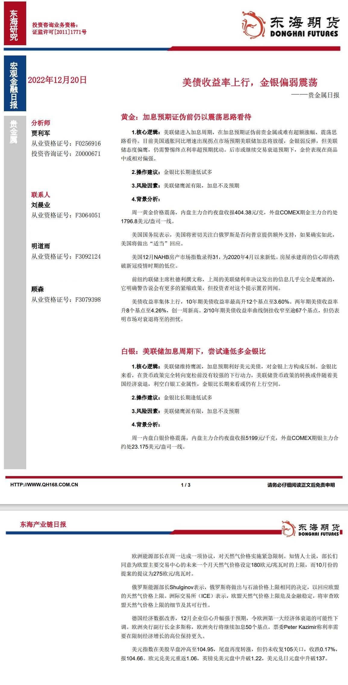 标题:【东海期货12月20日产业链日报】贵金属篇:美债收益率上行,金银偏弱震荡