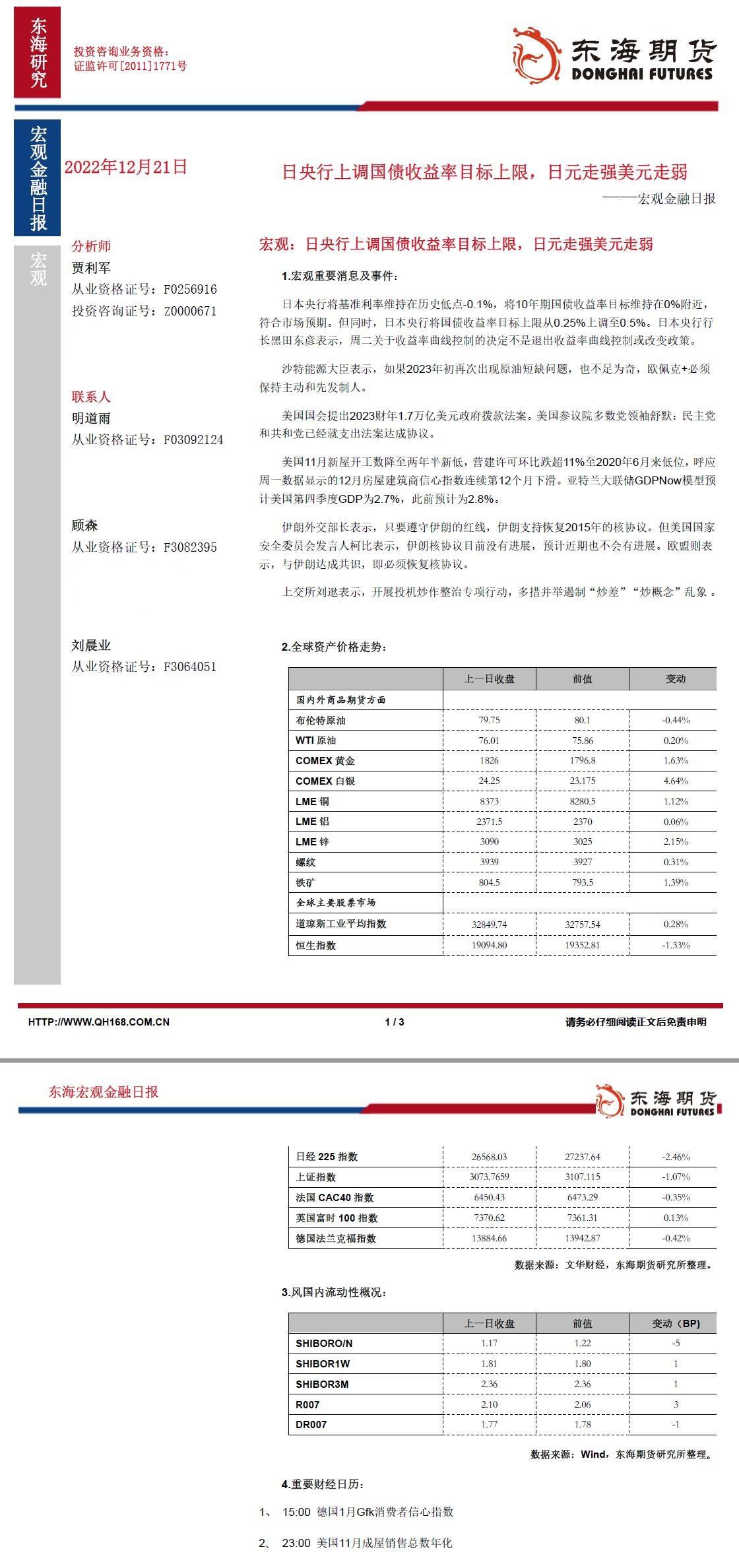 标题:【东海期货12月21日宏观金融日报】:日央行上调国债收益率目标上限,日元走强美元走弱