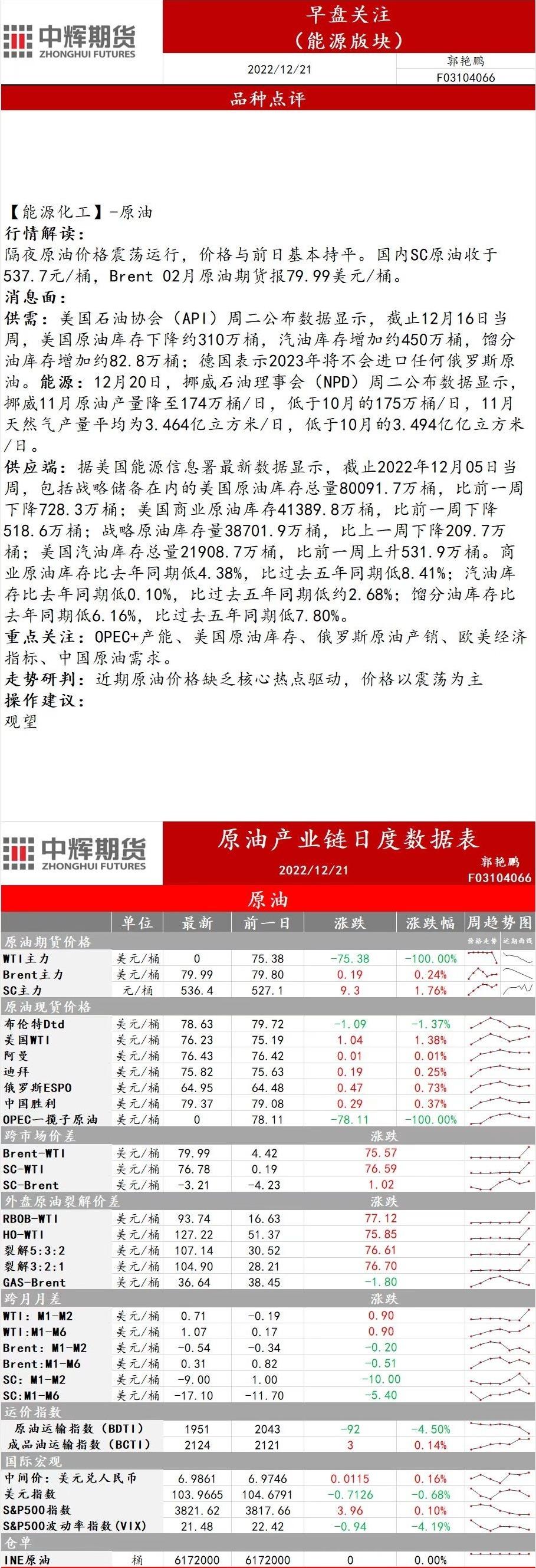 汇通财经APP讯——12月21日,中辉期货发布能源早盘关注,称近期原油价格缺乏核心热点驱动,价格以震荡为主,建议观望。 中辉期货公司授权文本由“专注期货开户交易及专业行情分析资讯网站”:【一期货 www.1qh.cn】转发