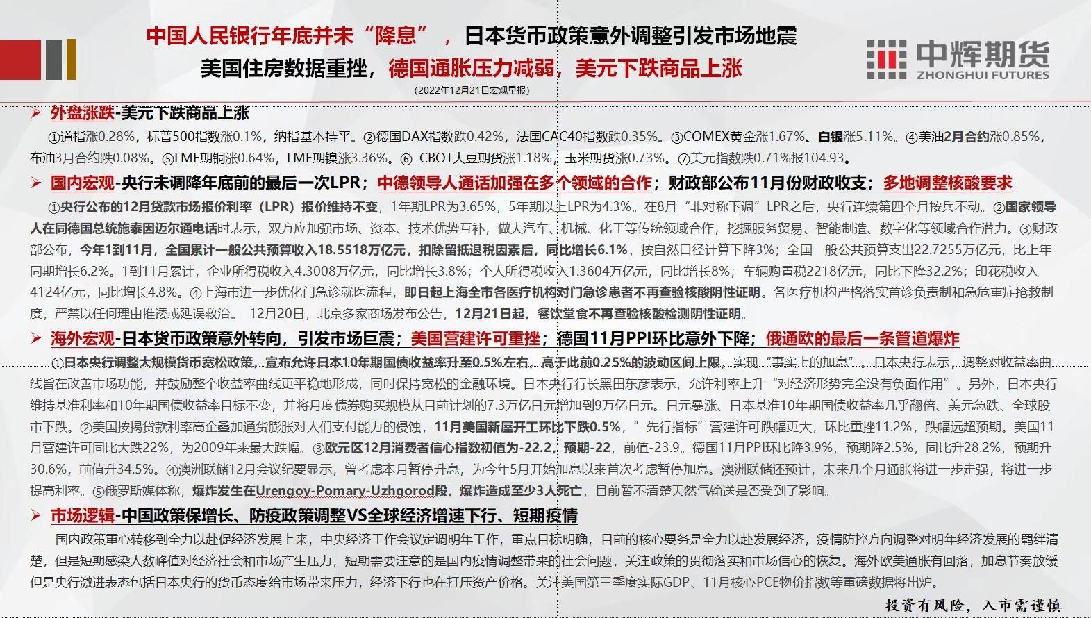 汇通财经APP讯——12月21日,中辉期货发布宏观早报,称欧美通胀有回落,加息节奏放缓,但是央行激进表态给市场带来压力,经济下行也打压资产价格,本周关注美国第三季度实际GDP,11月核心PCE物价指数等数据。