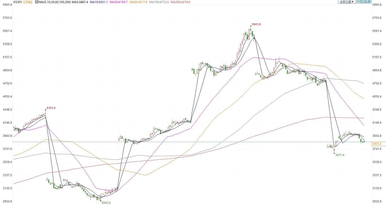 【今日涨跌】四大期指涨跌互现。IH2301收盘价为2627.4,收涨0.59%;IF2301收盘价为3855,收涨0.29%;IC2301收盘价为5802,收跌0.94%;IM2301收盘价为6206,收跌1.37%。