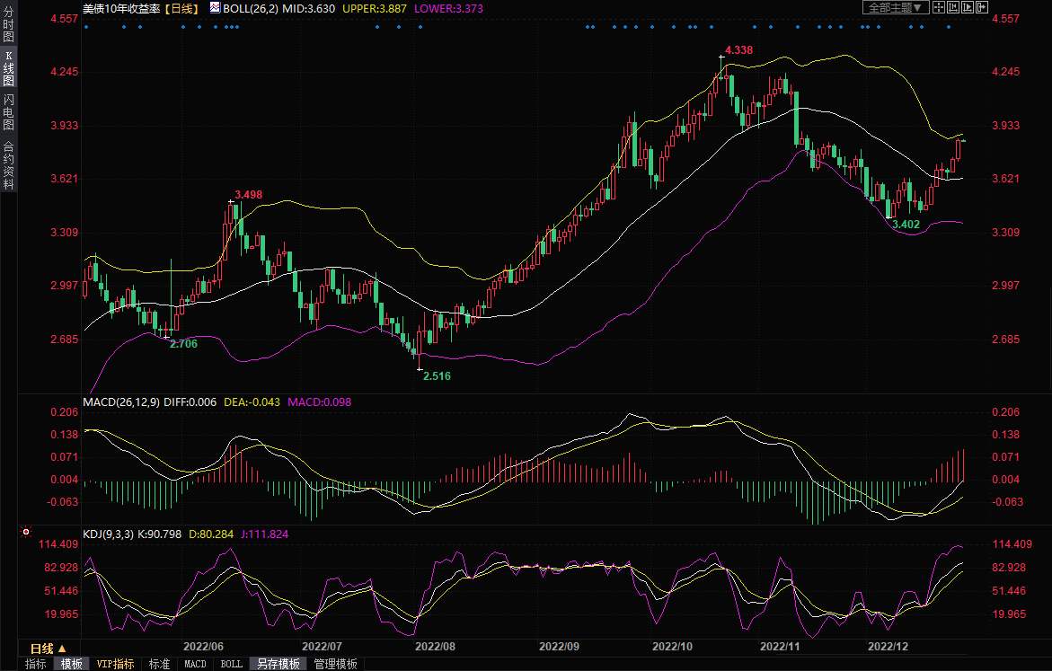 10年期美债收益率周二攀升10.4个基点,收报3.851%,稍早触及3.862%的11月16日以来高位。Aptus Capital Advisors固定收益分析师John Luke Tyner表示:“收益率很可能继续攀升,市场消化现在正投放到民间部门的大量国债供应。长话短说,在短期内,我们将看到长债收益率以经济衰退为主题进行交易,短债收益率基本受美联储预期推动,在我们看到一些新数据之前,将很难突破这个区间。”