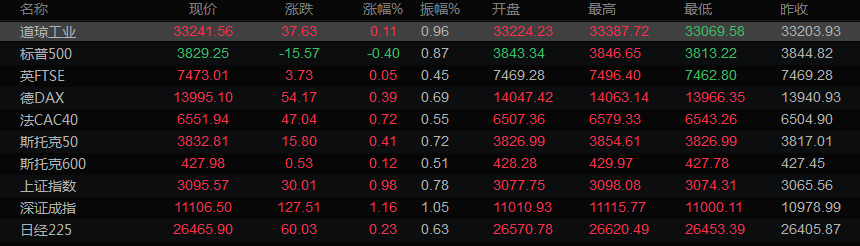 美股收盘情况:道琼斯指数收盘上涨0.11%,报33241.63点;标普500指数收盘下跌0.38%,报3830.24点;纳斯达克综合指数收盘下跌1.38%,报10353.23点。