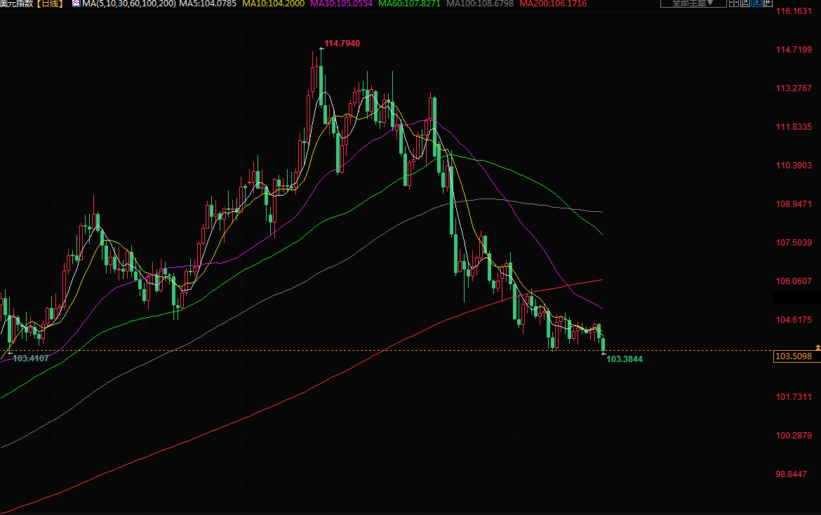 美元指数周五下跌约0.433%,报103.530,流动性因假期而降低。