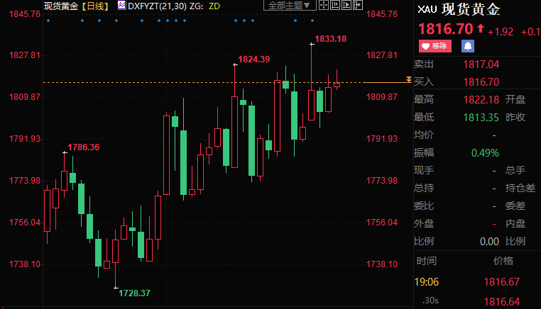 截至发稿,现货黄金周线上涨1.07%至1816.82美元/盎司;COMEX期金主力合约周线上涨0.96%至1823.3美元/盎司;美元指数周线下跌0.55%至103.742。