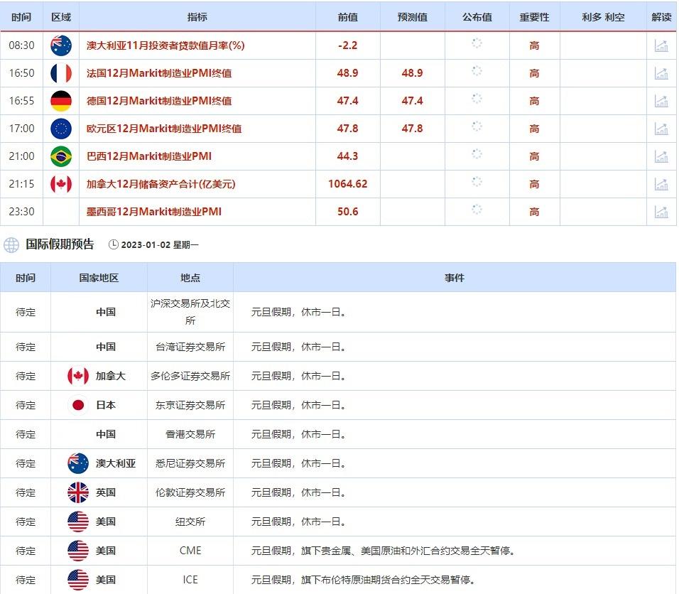 1月2日当天,投资者还需关注中国、加拿大、日本、澳大利亚、英国和美国元旦假期的休市公告。