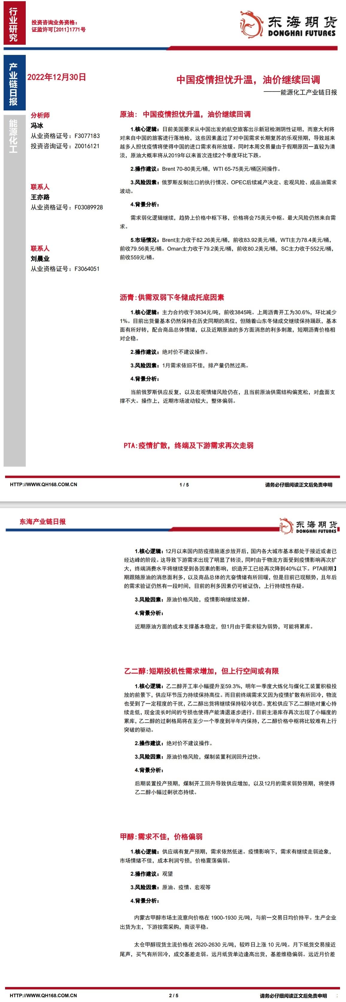标题:【东海期货12月30日产业链日报】能化篇:中国疫情担忧升温,油价继续回调