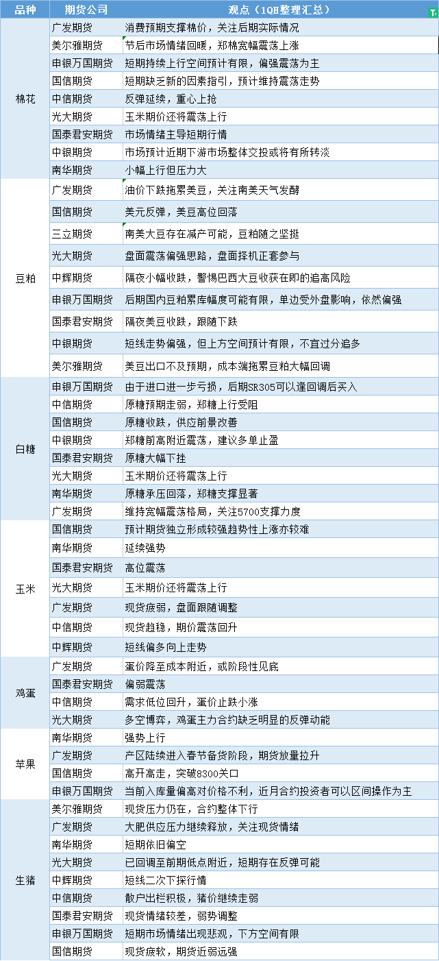 汇通财经APP讯——期货公司观点汇总一张图:1月4日农产品(棉花、豆粕、白糖、玉米、鸡蛋、生猪等)
