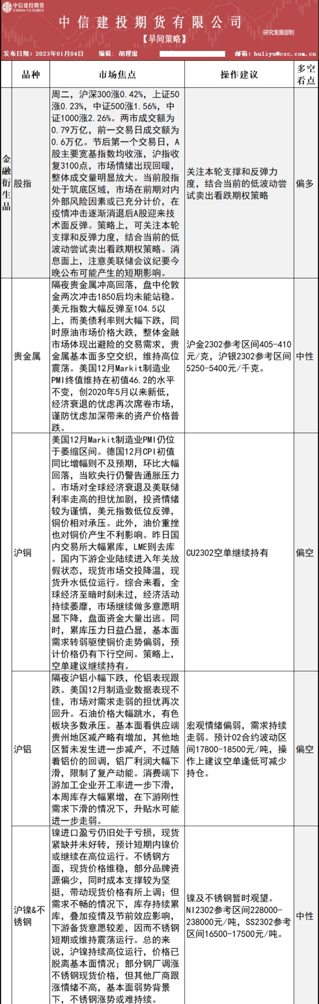 标题:中信建投期货1月4日早间交易策略