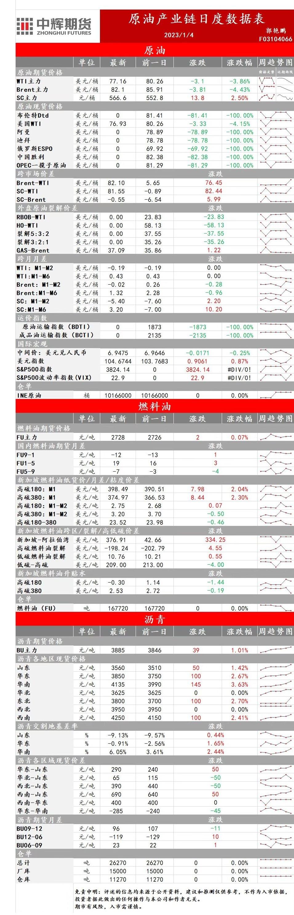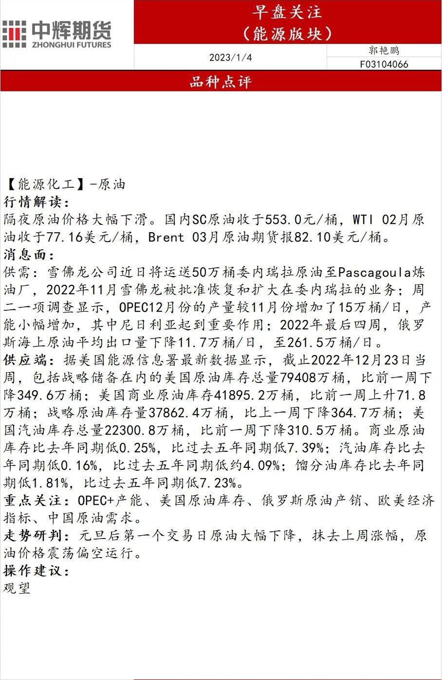 汇通财经APP讯——1月4日,中辉期货发布能源早盘关注,称原油价格震荡偏空运行,建议观望。 中辉期货公司授权文本由“专注期货开户交易及专业行情分析资讯网站”:【一期货 www.1qh.cn】转发